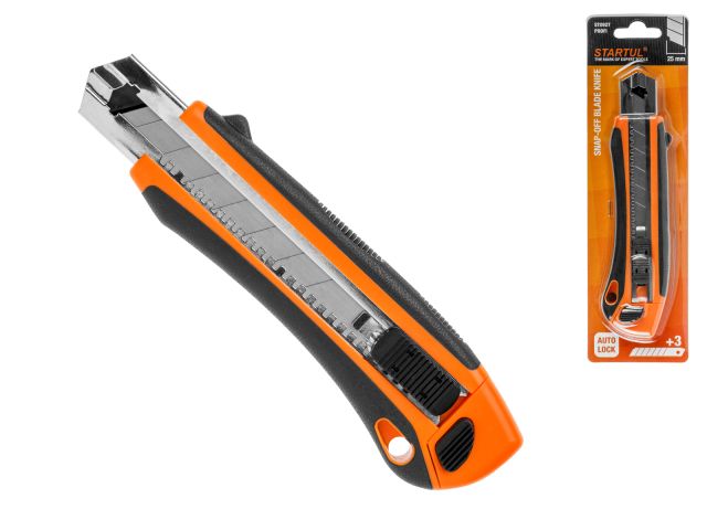 Главная » Ручной инструмент » Общестроительный инструмент » Ножи, скребки, шила » Нож пистолетный с выдвижным лезвием 25мм + 3 лезвия STARTUL PROFI (ST0927) (ABS + TPR покрытие корпуса 3 лезвия в комплекте)