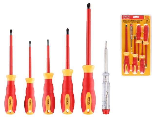 Главная » Ручной инструмент » Слесарно-столярный инструмент » Наборы отверток » Набор отверток диэлектрических 6шт STARTUL MASTER (ST3051-6) (Комплект: SL4.0х0.8х100мм, SL5.5х1.0х125мм, PH1х80мм, PH2х100мм, PH3х150мм, тестер)