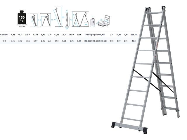 Главная » Строительное оборудование » Лестницы, стремянки, леса, подмости, мусоропровод строительный » Лестница алюм. 3-х секц. 316/552/316см 3х9 ступ., 10,3кг NV1230 Новая Высота (макс. нагрузка 150кг)