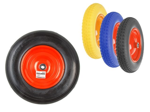 Главная » Строительное оборудование » Тачки и тележки » Колесо полиурет. 4.00-8" (подшипн. усил. ф35x16 мм, для оси 16x60мм) (Подходит к тачкам: WB6820-2HD) (ECO)
