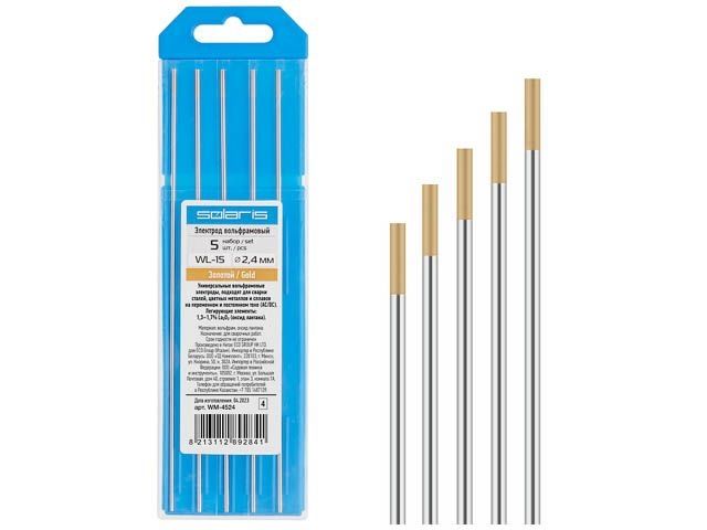 Главная » Сварочное оборудование и материалы » Электроды » Электроды вольфрамовые » Электрод вольфрамовый золотой WL-15, Ф 2,4 мм (набор 5 шт) SOLARIS